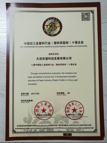 实德研究院申报的中国轻工业行业十强,经过行业协会领导及专家审查,实德科技公司被评定为“中国轻工业(塑料异型材)十强企业”。