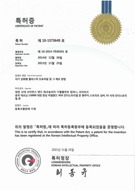 实德聚酯合金技术发明专利《自增强型塑料异型材及其生产方法》,获得了韩国专利厅授予的第10-1573649号《发明专利证》,这是实德集团首次获得国外专利授权的发明创造。