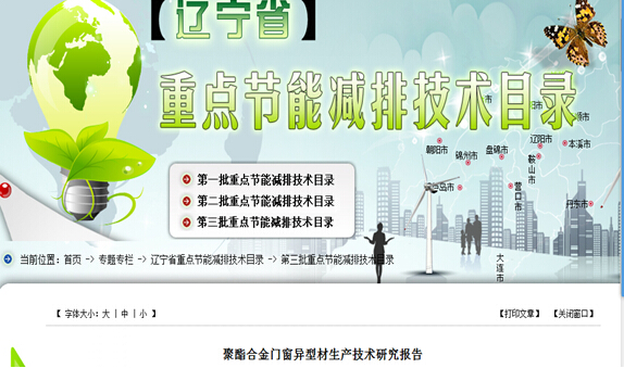 辽宁省政府为加快推进重点节能减排技术的推广普及,引导企业采用先进新技术、新工艺及新设备,涉及冶金、能源、石化、化工、电力、建筑、建材、装备制造和环保等行业,共评选出30项重点节能减排技术。实德聚酯合金门窗异型材生产技术研究进入此目录。