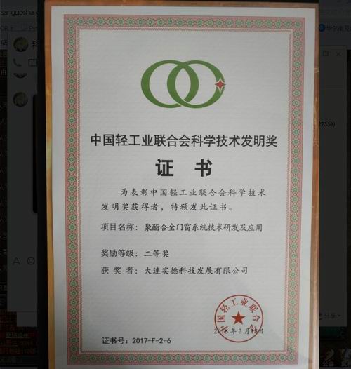 2018年3月20日,由实德科技研究院负责研发并组织申报的实德聚酯合金门窗系统技术获得了中国轻工业联合会科学技术发明奖二等奖。